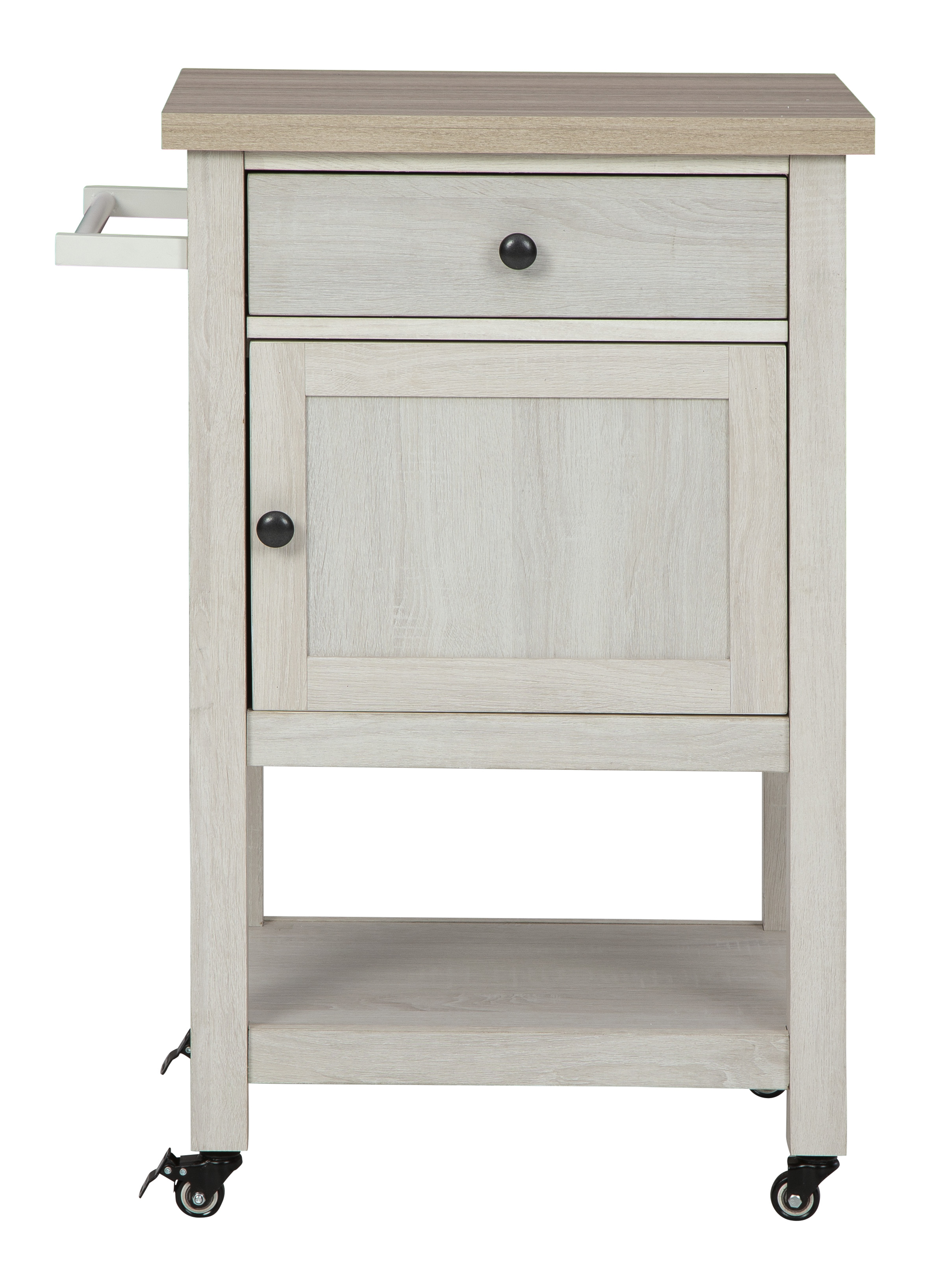 Cheers to the handy and trendy Boderidge collection. Roll out rustic flair with this ultra-cool bar cart. Whether serving as a mobile cocktail station for entertaining or serving up style in the dining room, this easy-going cart with durable melamine top and locking casters offers so much durability and versatility. Complete with 1 door concealing additional storage, 1 drawer, towel bar and fixed shelf, this cart simply says welcome home.Read More