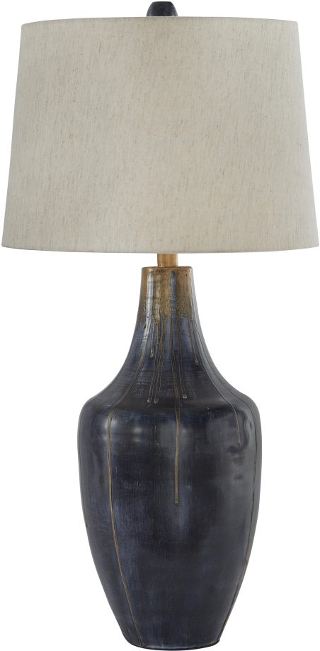 Turn the 3-way switch and cast a warm glow from the modified drum shade of the Evania table lamp. The indigo and gold-tone metal showcase your tasteful style.