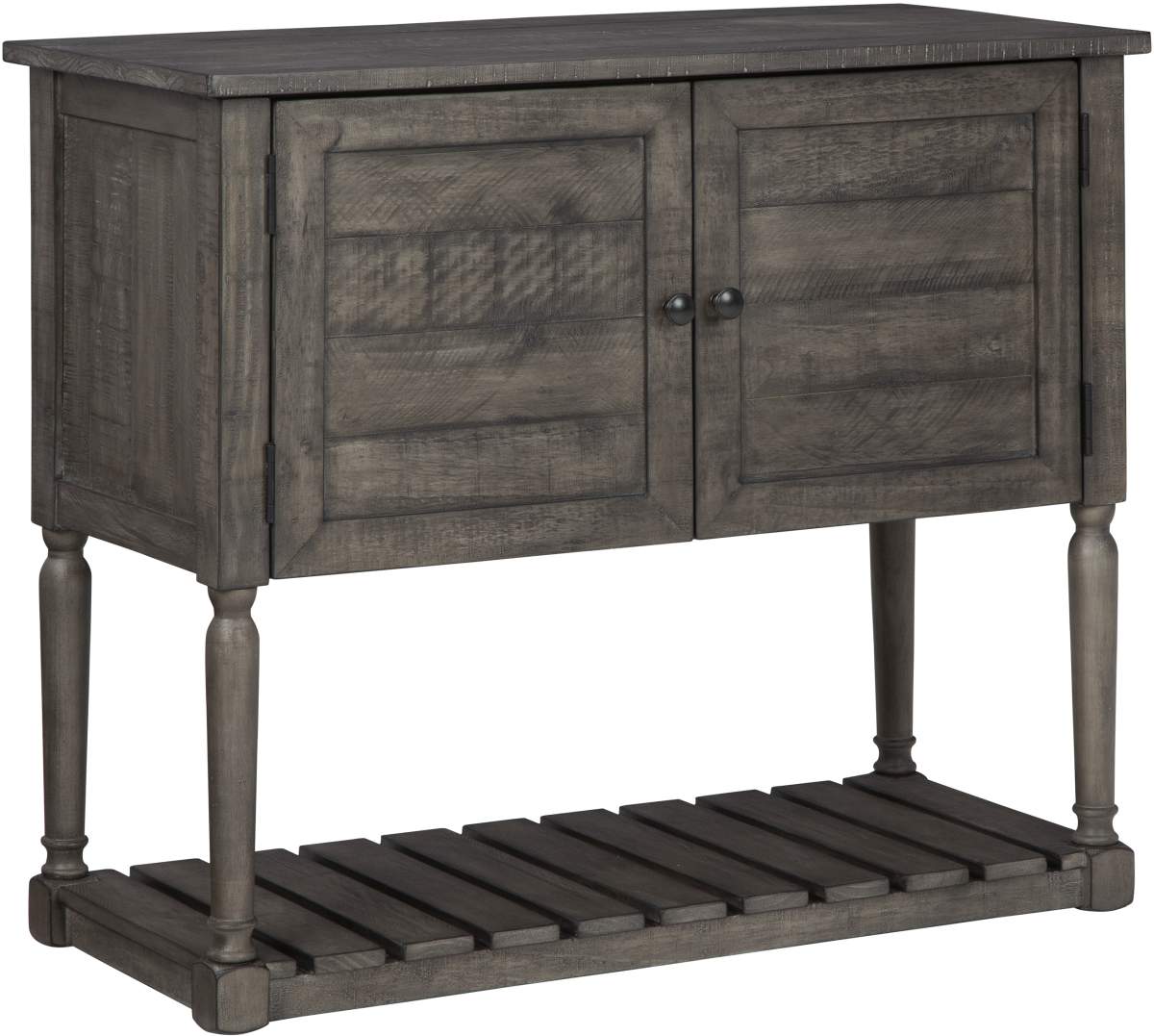 Storage and style are made easy with this accent cabinet. The plank door front and open air storage shelf bring a natural look, while pewter finished hardware adds an industrial touch. In an antiqued gray finish, this accent cabinet offers endless design possibilities.Read More