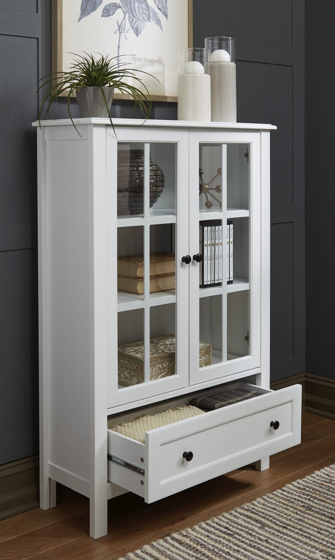 A master of effortless flair, this accent cabinet allures with farmhouse styling. The black metal pulls delight fans of rustic-chic style. Glass panel upper doors add a sophisticated touch, transforming this piece into something well beyond ordinary.Read More